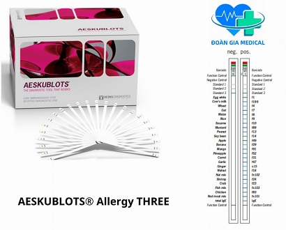 AESKUBLOTS Allergy THREE, 24 farklı alerjene karşı IgE antikorlarının ve insan serum ve plazmasındaki toplam IgE'nin kantitatif tespiti için membran bazlı bir enzim immünolojik testidir. Antijenler, nitroselüloz bir membran üzerinde tam olarak tanımlanmış konumlarda paralel çizgiler halinde bulunur. Bu test, tip I alerjinin ayırıcı tanısında bir araçtır.